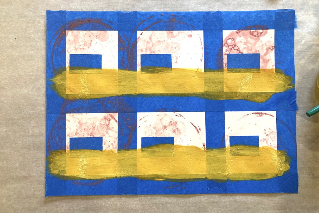 Press one rectangle firmly into each frame, placing it in roughly the same location every time. The tape should cover a small portion of the bubble print pattern. This simple step protects a portion of the original DIY bubble print art before the next layers of paint are added. Later, when the tape is removed, those small sections will reveal the untouched bubble prints beneath. It’s a subtle detail, but it adds a wonderful element of surprise to the finished artwork.