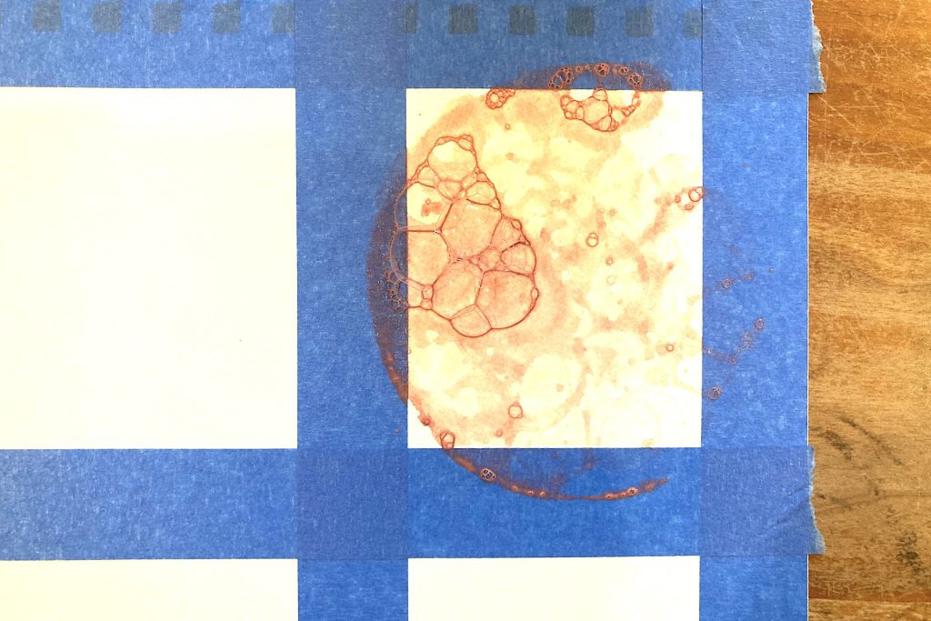Take your time as you remove the tape and pull it back gently so you don’t lift any paint or paper fibers. When the tape comes off, the first layer of bubble print art appears again like a tiny window within each frame.