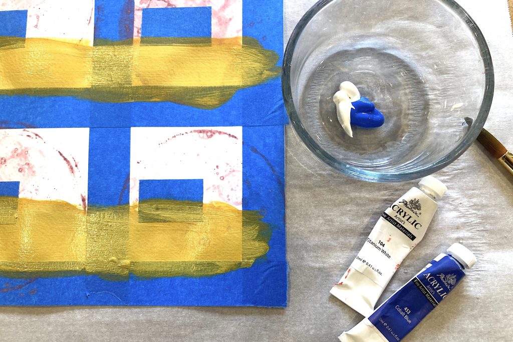 While the yellow paint is still wet, prepare the color for the upper portion of the frame. Mix good-sized dollops of cobalt blue with titanium white until you reach a soft sky-blue tone.