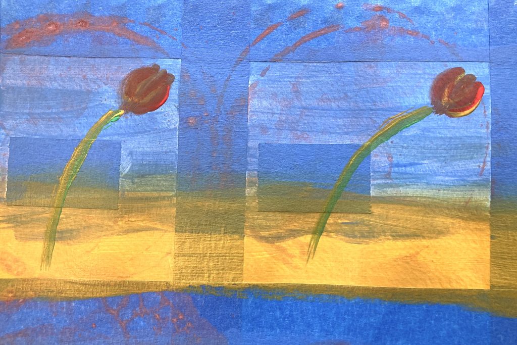 In the upper right corner of each frame, make three confident brush strokes to form the tulip petals. Start each stroke near the top of the petal and pull the brush downward so the three strokes meet at their base. If you like, practice the motion on a scrap piece of paper first until you are comfortable with the shape.