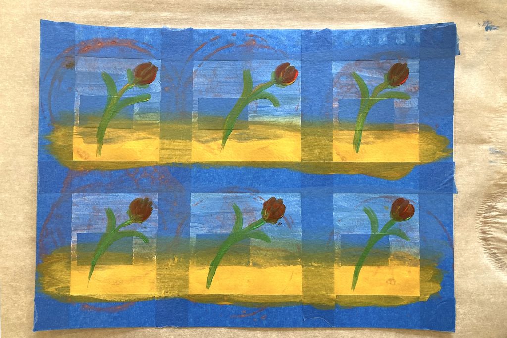 From the base of each tulip head, sweep the brush in a graceful arc down toward the yellow band near the lower left side of the frame. The stem should cross right over the taped rectangles that are protecting the bubble prints underneath.