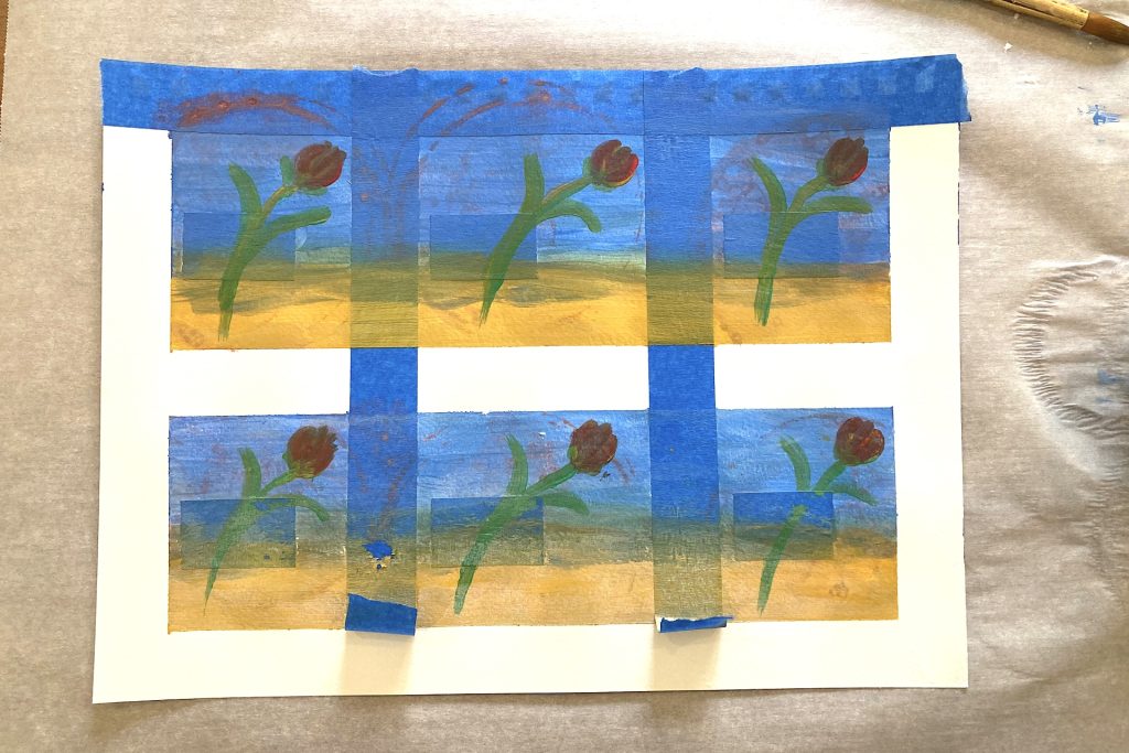 Next, place a strip of tape horizontally across the center of the page to divide the sheet in half. Then add two additional vertical strips, spacing them evenly so each section is divided into thirds. Once finished, you will have a grid of six small frames ready for painting.
