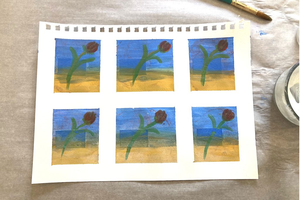 Brush this mixture across the top portion of each frame, allowing it to overlap slightly with the wet yellow section below. Where the colors meet, they will naturally blend together and create subtle touches of green.