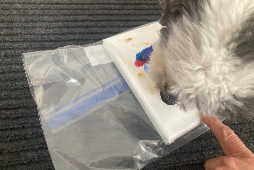 Adjust the amount of peanut butter based on your dog’s size. For example, the Golden Retriever’s bag needed a more generous spread, while the small Shih Tzu required only a light amount. If you’re working with a small dog and want fuller color blending, you can always repeat the activity over a couple of sessions instead of increasing the portion.