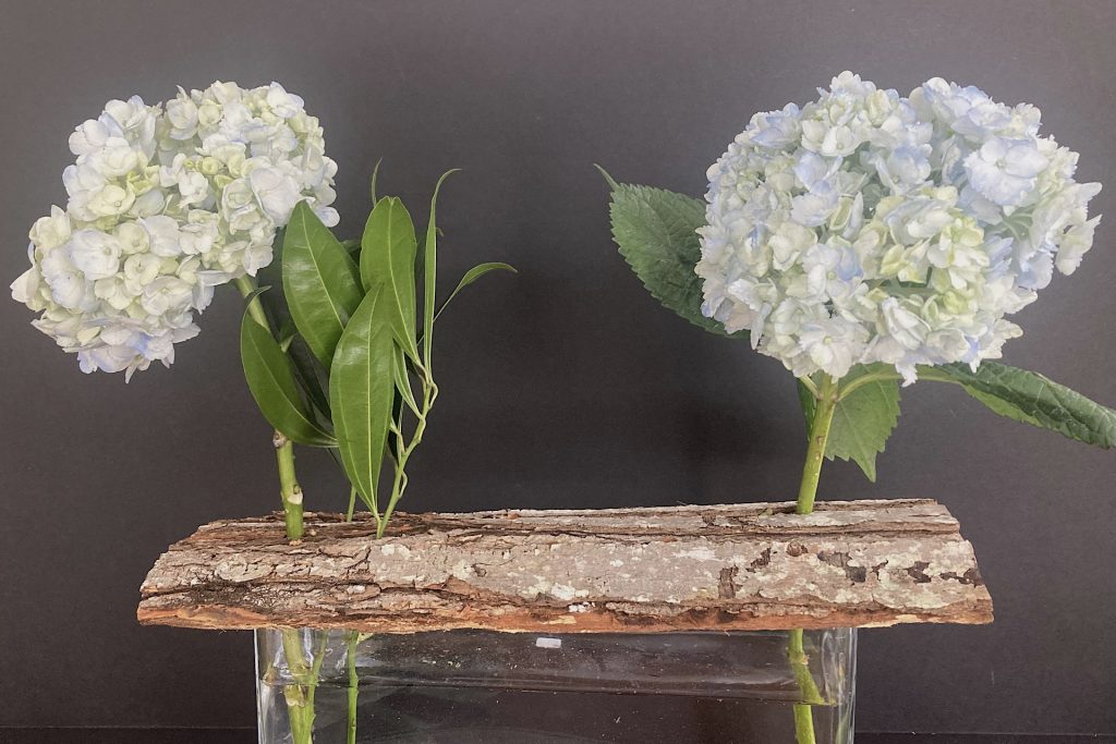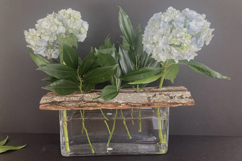 I began with my largest hydrangea blooms. I positioned one at each end of the bark for balance.
