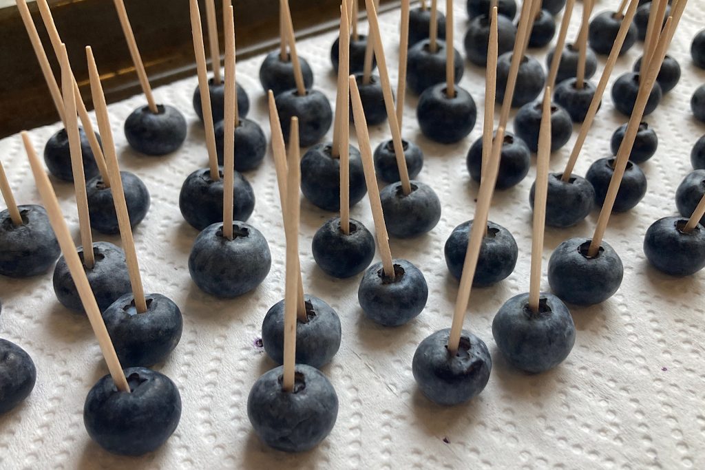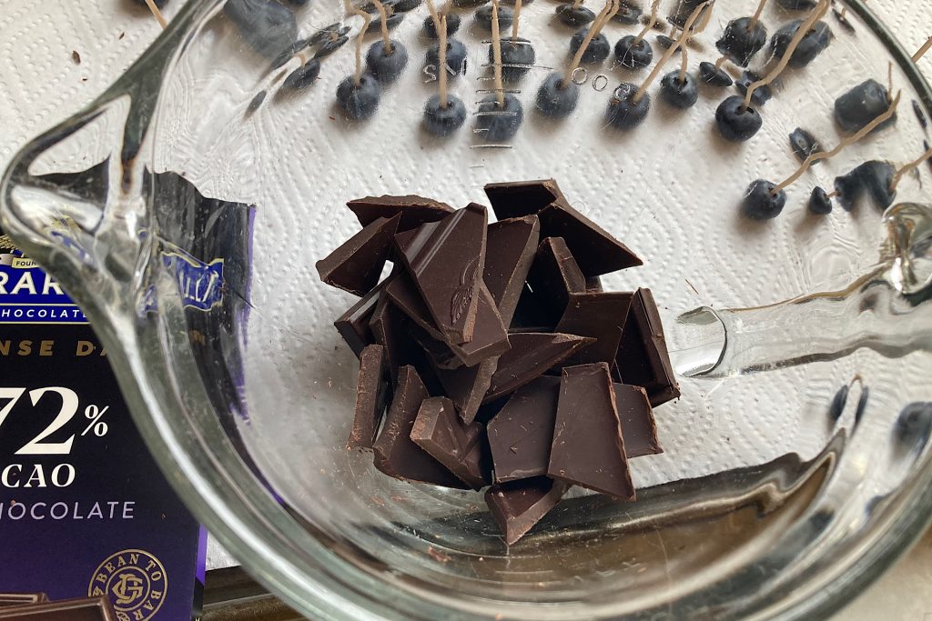 I like to do this step ahead so everything is ready when I’m ready to dip. Even a small amount of moisture can affect how the chocolate adheres, so fully dry blueberries are essential for successful chocolate dipped blueberries.