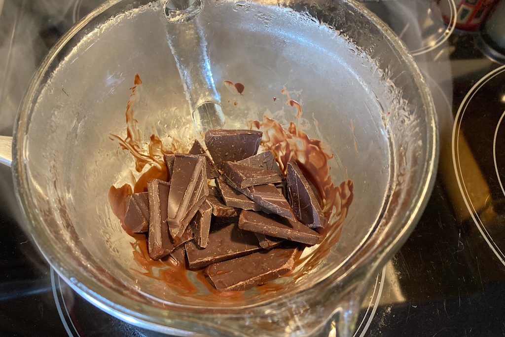While a microwave works just fine, I prefer using the double boiler method so I can keep a close eye on the chocolate and avoid overheating it. For this batch, I used a stainless-steel pan filled with simmering water and suspended a large 1-liter Pyrex measuring cup over the top. It’s simple, steady, and gives you beautifully smooth melted chocolate every time.