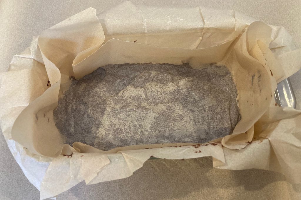 To get started, line an 8.5 x 4.5–inch freezer-safe loaf pan with a sheet of parchment paper. It may take a wee bit of folding and adjusting, but this step is worth it — the parchment makes it easy to lift the finished healthy no-bake chocolate banana freezer bars cleanly from the pan once frozen. No sticking, no stress.