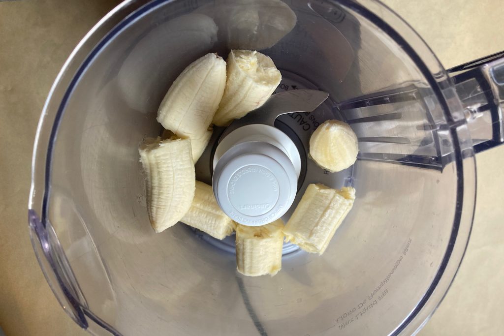 Peel the two bananas and break or cut them into chunks that will fit easily into your food processor. Add the vanilla and a pinch of salt. I like to be a little generous with the salt since it pairs so well with chocolate, but you’ll quickly get a feel for what you prefer once you make your first batch.