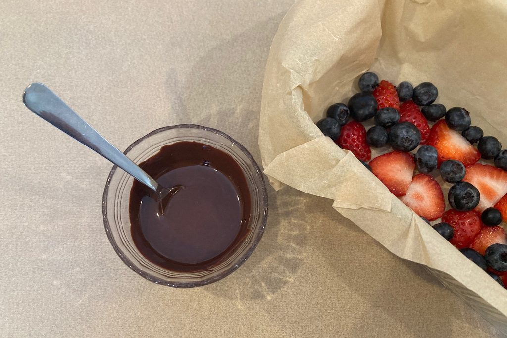 Next, melt the chocolate. I usually reach for a double boiler, but since this recipe uses a small amount, I melted the four squares of Ghirardelli dark chocolate in a small Pyrex bowl in the microwave. Heat the chocolate for 20 seconds, stir, then heat for another 20 seconds, watching carefully so it doesn’t overheat. A few small lumps are fine — they’ll smooth out as you stir.
